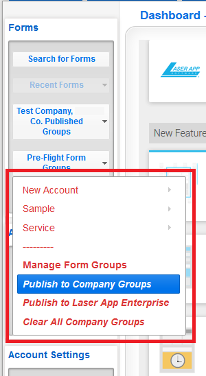 2. Next, select Pre-Flight Form Groups from the Forms menu of the Dashboard. The entry on the list is titled Publish to Company Groups. Select Publish to Company Groups